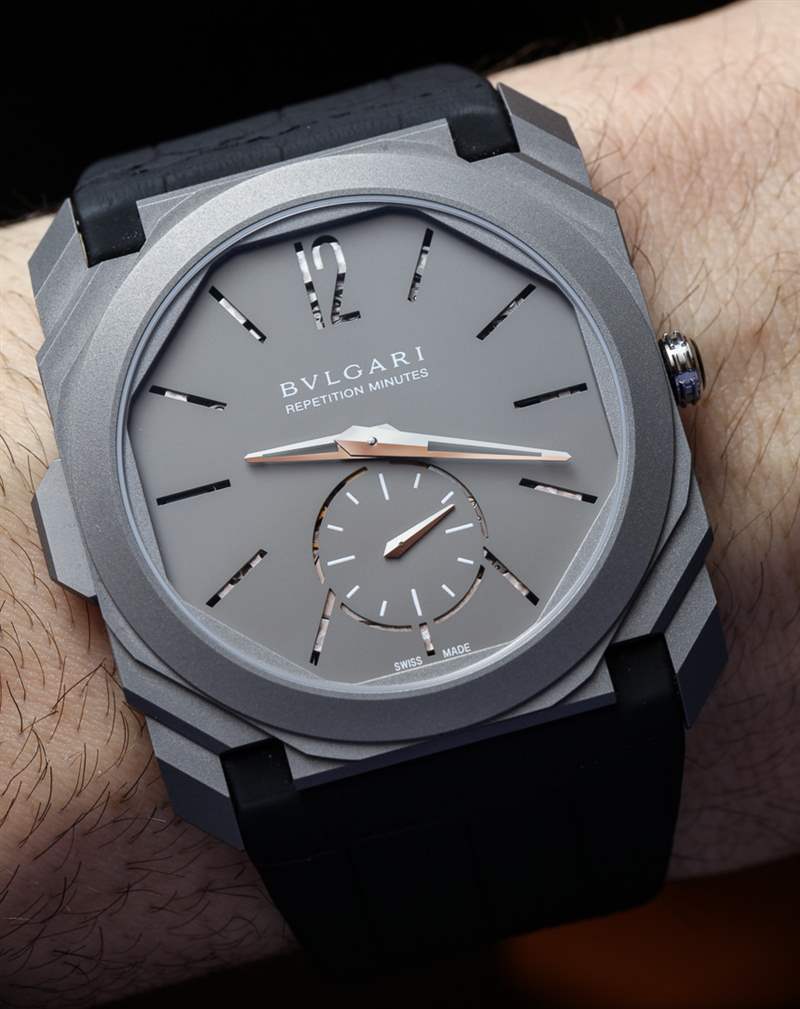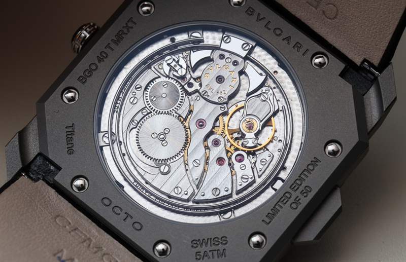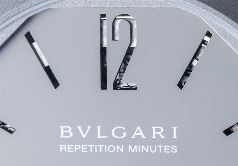 在噴砂鈦中,這種近乎工業(yè)的表面處理并不是大多數(shù)人對高端奢華手表的期望。話雖如此,鈦是用于三問報(bào)時(shí)表的最佳材料之一,因?yàn)樗奶匦圆粫p弱報(bào)時(shí)的聲音。黃金或鉑金等貴金屬是響亮的三問表的大敵,而當(dāng)您想要最響亮、最清晰的聲音時(shí),鋼和鈦是更好的選擇。寶格麗不僅將鈦用于表殼材料,還用于表盤。如果仔細(xì)觀察,您會注意到寶格麗 Octo Finissimo 三問報(bào)時(shí)腕表最有趣的設(shè)計(jì)細(xì)節(jié)之一:鏤空時(shí)標(biāo)和小秒盤。這不僅僅是為了風(fēng)格,而是作為幫助聲音傳播的一部分,從而充分利用內(nèi)部空間讓鈴聲產(chǎn)生共鳴。