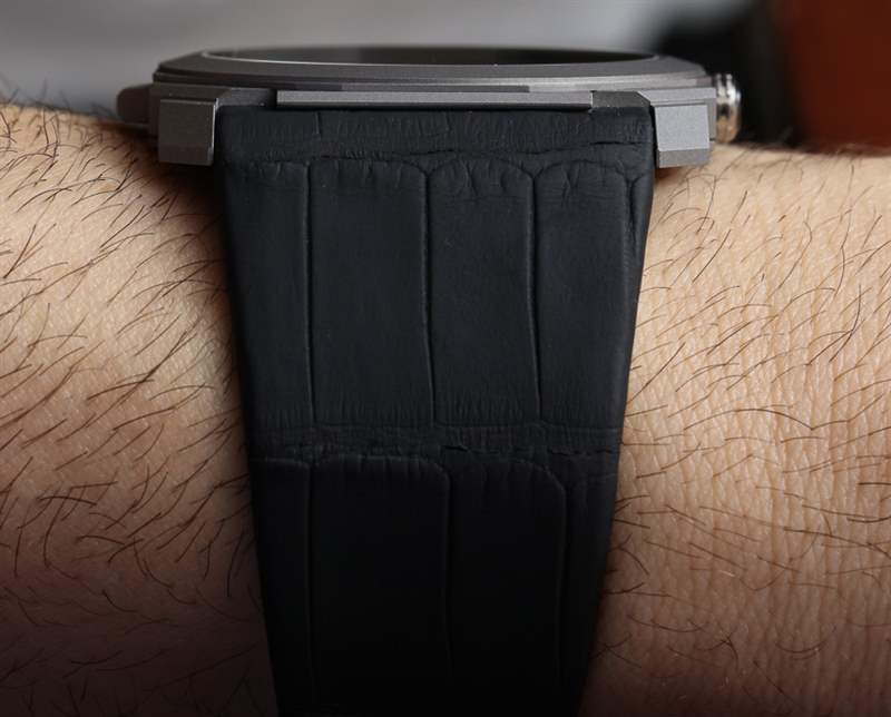 Bulgari Octo Finissimo 三問報(bào)時(shí)腕表配有啞光黑色硫化鱷魚皮表帶和折疊式鈦金屬表扣。觀看上面的視頻,了解這種美麗的聲音。
