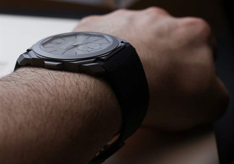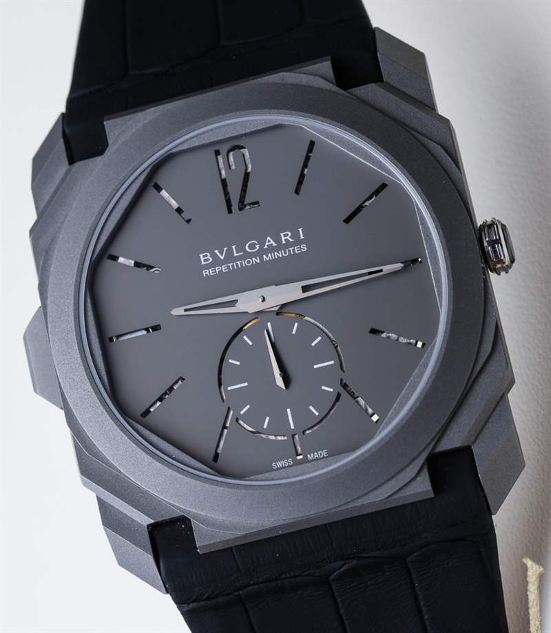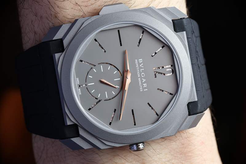 那么讓我們談?wù)劤叽纾驗(yàn)檫@是一款破紀(jì)錄的手表。Bulgari Octo Finissimo 三問報(bào)時(shí)表殼厚 6.85 毫米,寬 40 毫米,采用涼爽的噴砂鈦材料制成。表冠也是鈦金屬,但經(jīng)過拋光處理并鑲嵌有黑色凸圓形陶瓷。這比之前創(chuàng)下“最薄三問報(bào)時(shí)表”記錄的Vacheron Constantin Patrimony Contemporaine Calibre 1731 Minute Repeater 薄了超過一毫米,后者于 2014 年記錄了大約8.09 毫米厚的表殼。廣告留言廣告信息結(jié)束