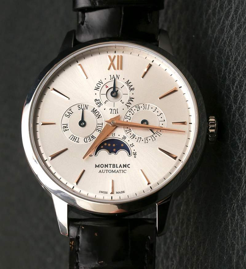 萬年歷 39 毫米寬,厚度僅約 10 毫米。鑒于機芯是帶模塊的底座,這非常好。Monblanc 將提供精鋼和 18k 玫瑰金萬年歷。真正的價值當然在于帶有玫瑰金指針和小時市場貼花的精鋼表殼。這將是一個萬年歷——一個不錯的——價格是大多數人以前從未見過的。