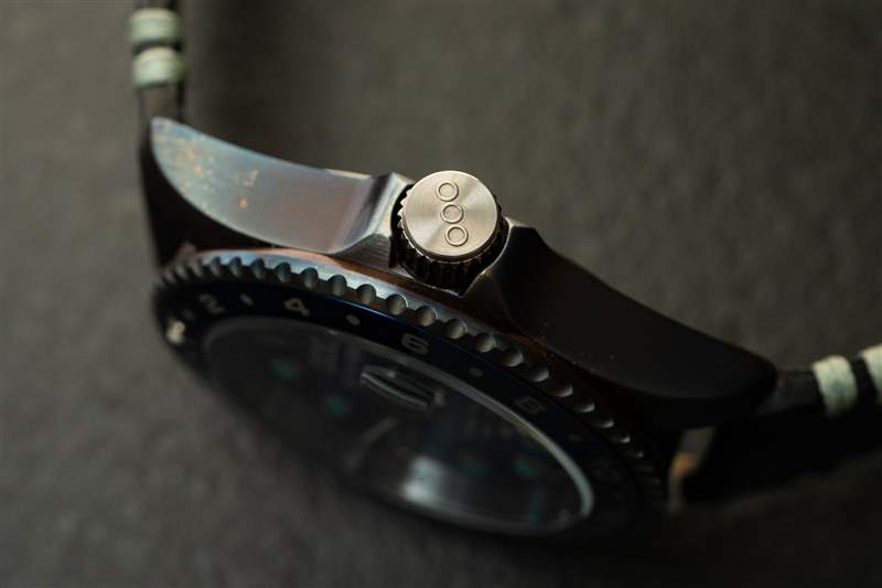 從相似之處開(kāi)始,每款手表均采用 42 毫米寬(表圈處 43.5 毫米)、12.7 毫米厚和 5??0.4 毫米表耳到表耳(根據(jù)我的測(cè)量)316L 不銹鋼表殼,由瑞士制造Ronda 515 24 小時(shí)石英機(jī)芯。這些表殼雖然由 316L 不銹鋼制成,但由于經(jīng)過(guò)了 Out of Order 的老化過(guò)程,因此不會(huì)呈現(xiàn)出標(biāo)準(zhǔn)的鋼色調(diào)。這種老化過(guò)程會(huì)產(chǎn)生帶有斑點(diǎn)、漩渦和獨(dú)一無(wú)二的圖案的銅色調(diào),其顏色從深墨紫色到帶有翠綠色調(diào)的金色黃銅。盡管外觀陳舊,但表殼的精細(xì)拉絲飾面在表面之間呈現(xiàn)出清晰的過(guò)渡,并且沒(méi)有可見(jiàn)的工具路徑痕跡。