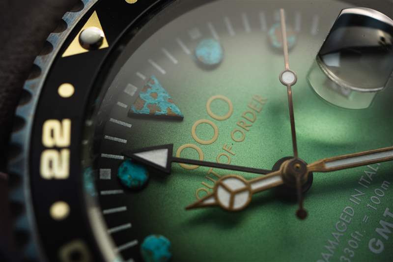Out of Order Oxidized Green GMT New York 從自由女神像的氧化銅中汲取靈感——可以在底蓋上找到——帶有充滿(mǎn)活力的祖母綠表盤(pán),在深黑色的環(huán)繞中漸暈。帶紋理的綠色銅銹在所應(yīng)用的時(shí)標(biāo)上完美呈現(xiàn),層層疊疊的銅綠色讓位于下方銅的光澤。這些相同的時(shí)標(biāo)也出現(xiàn)在 Very Blu GMT New York 上,雖然它們與這個(gè)版本的藍(lán)色主題不太相配,但白色的夜光周?chē)兄谔岣咭鬃x性。