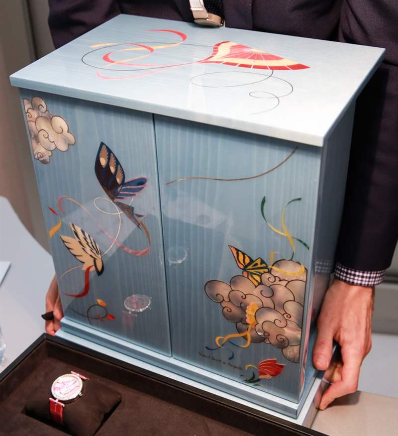 看看盒子上令人驚嘆的細節(jié)和手工作品。柜式木箱,彩繪精美,飾以珍珠母貝鑲嵌圖案。老實說,看到這些展示盒和每年看到這些手表一樣興奮。您還會注意到盒子有多大。
