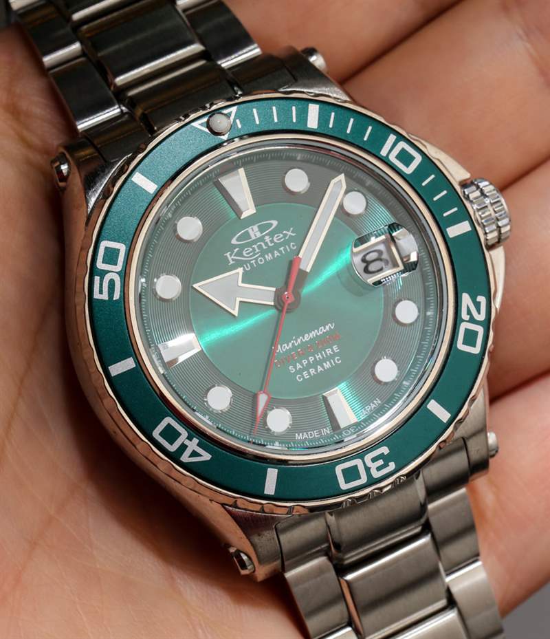 新款 Kentex Marineman 寬 45 毫米,采用不銹鋼或 IP(離子鍍層)黑鋼表殼。實際上兩者看起來都不錯。在日本手表中很難找到 PVD ??涂層工藝,但他們的 IP 處理通常非常好。雖然我更喜歡日常佩戴的拉絲/拋光鋼表殼,但黑色的 Marineman 表殼看起來很酷。我不確定是否所有表盤/表圈顏色版本都提供黑色。同樣重要的是要注意,并不是所有的顏色版本都在這篇文章中被描繪出來。據(jù)我所知,新款 Marineman 腕表提供黑色、黑紅、綠色、藍色和白色珍珠貝母表盤版本。