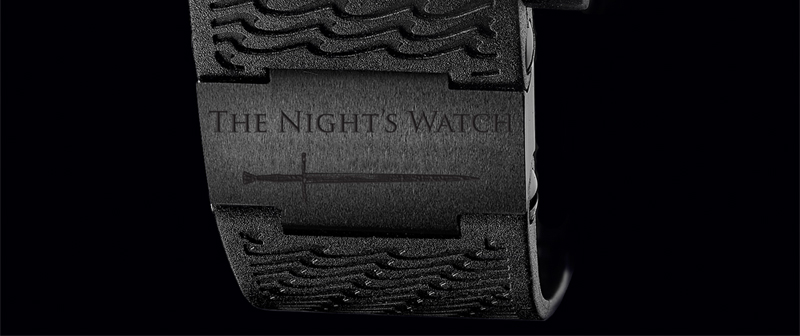 附在手表上的是一條帶有兩個陶瓷鏈節的橡膠表帶。這就是守夜人元素的用武之地。其中一個鏈節上,雅典表用劍雕刻了“守夜人”標志,而另一個鏈節上則刻有“我是黑暗中的劍”的守夜人座右銘被刻上。目前尚不清楚手表背面是否有任何權力的游戲品牌。瑞士自動機芯的功能包括時間、小秒針、日期和動力儲存指示器。