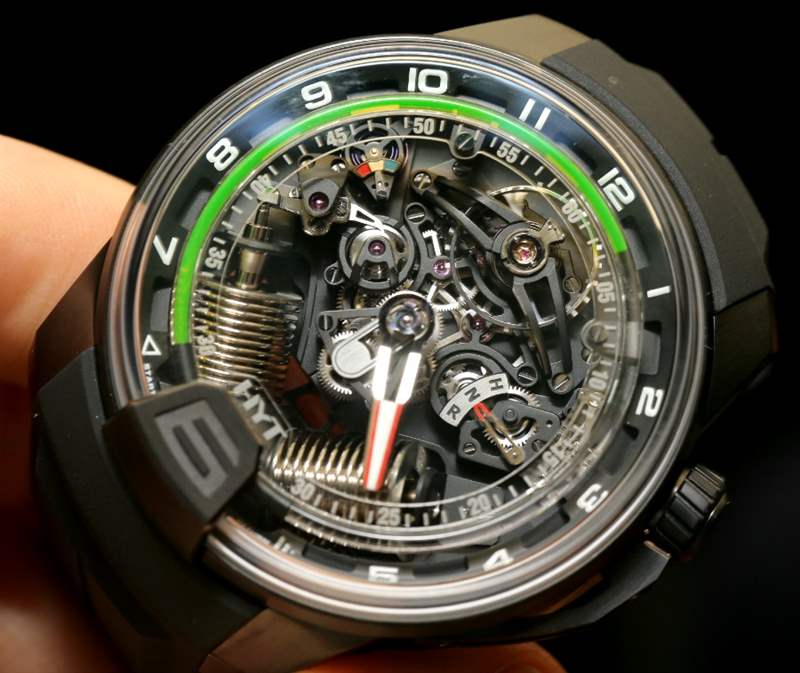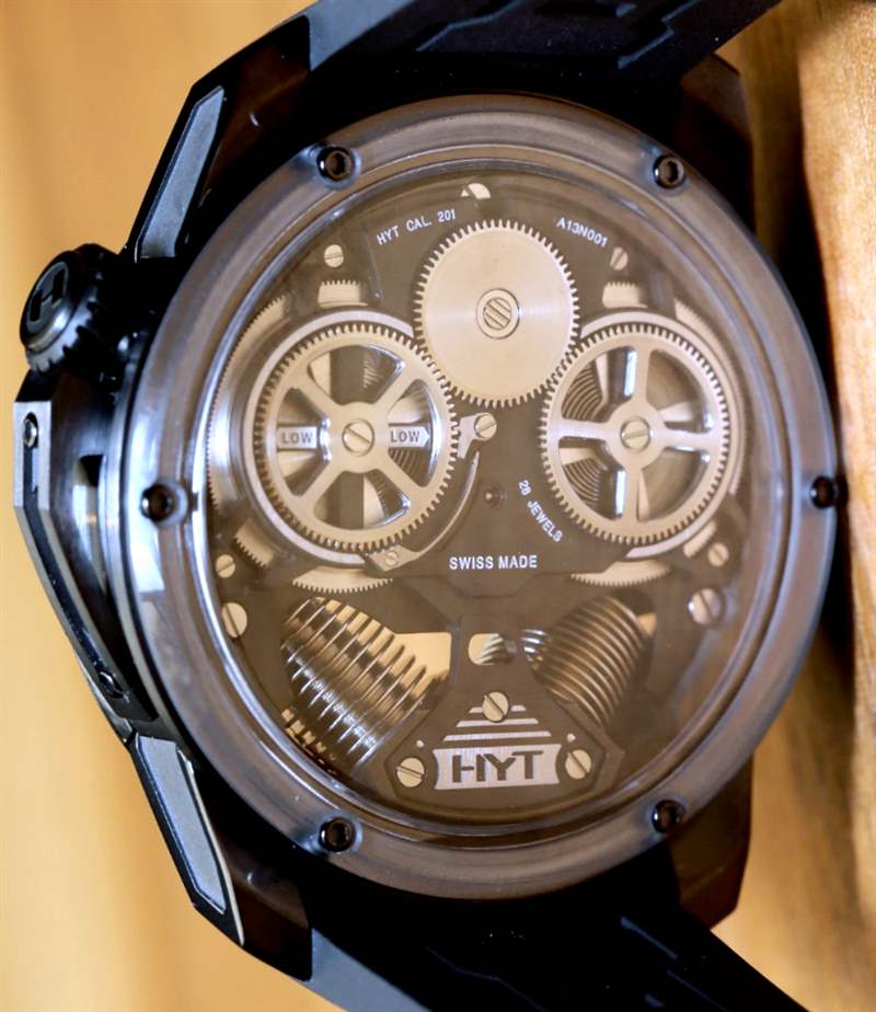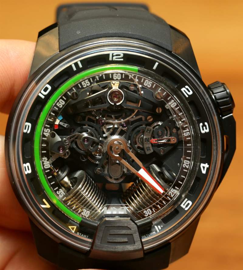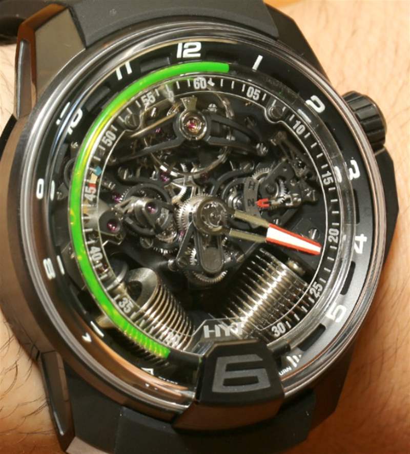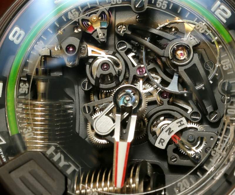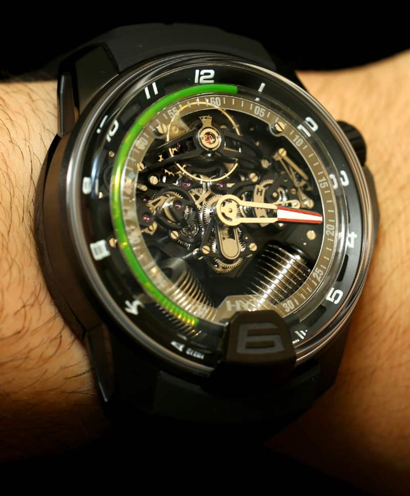 如果您閱讀過我們首次發(fā)布 H2 的文章,您就會(huì)了解其近 49 毫米寬的尺寸和黑色 DLC 涂層鈦金屬表殼。在手腕上,它不僅感覺像一個(gè)小型發(fā)動(dòng)機(jī),其新對(duì)角對(duì)齊的波紋管的方向就像發(fā)動(dòng)機(jī)中的活塞。波紋管是液體小時(shí)系統(tǒng)的一部分,并與運(yùn)動(dòng)一起使用壓力移動(dòng)液體以指示小時(shí)。分鐘顯示在一個(gè)更大的中央分針上,它完全跳過表盤的底部,就好像它根本不存在一樣。它是跳分針的一種形式。表盤頂部附近還有一個(gè)大的外露擺輪。它看起來很棒,但如果他們將陀飛輪扔進(jìn)鍋里,很可能已經(jīng)毀了。廣告留言廣告信息結(jié)束