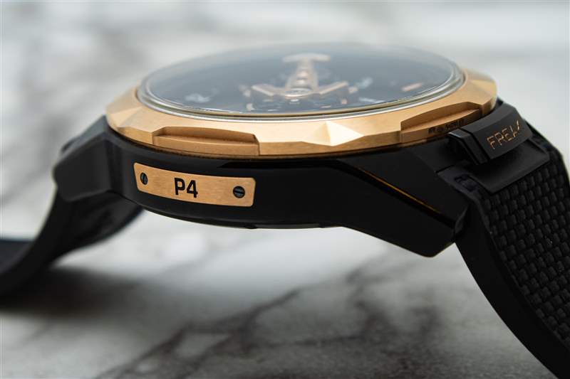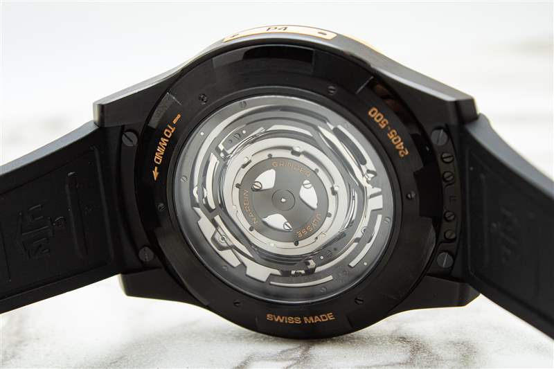 當然,實際上 Freak ONE 并沒有什么平庸之處,仔細觀察紅金表圈就可以立即看出這一點。基于這種拉絲和拋光元件中尖銳的刻面圖案,這個表圈可能看起來不對齊,但這是 Freak ONE 獨特的上鏈和時間設置系統(tǒng)的唯一真正的視覺線索。翻轉 6 點鐘位置的“Freak”牌,旋轉表圈就會解鎖,但旋轉的不僅僅是表圈本身。扭轉這個雙向表圈還可以向前和向后調整時間設置,為佩戴者提供與 Freak ONE 啟動對話的齒輪系的大規(guī)模觸覺連接。在背面,藍寶石顯示屏底蓋同樣非正統(tǒng)。通過逆時針旋轉底蓋外環(huán),佩戴者可以手動為機芯上弦,盡管 Freak ONE 的創(chuàng)新上鏈系統(tǒng)使得這一點基本上沒有必要(稍后會詳細介紹)。雖然 Freak ONE 的外殼非常耐磨,而且充滿了有趣的花招,但它的致命弱點就是防水。這是該手表日常佩戴理念面臨的最大障礙,因為 30 米的深度等級讓 Freak ONE 根本無法勝任許多運動場合的任務。