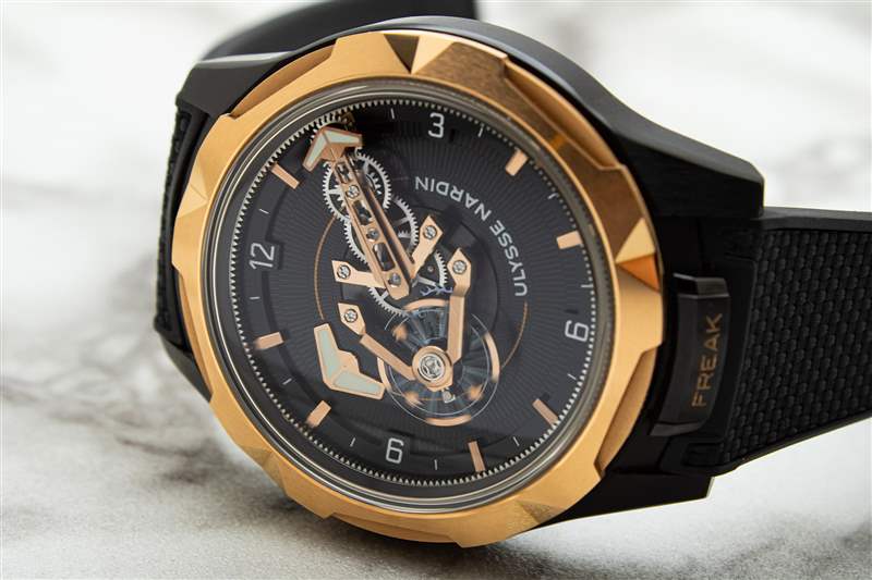 與之前的 Freak 型號一樣,Ulysee Nardin Freak ONE 的表殼具有一個一眼就能識別的特征——沒有任何表冠,從而形成了完全對稱的表殼輪廓。然而,從那時起,F(xiàn)reak ONE 與其前輩們有了很大的不同。除了無表冠的設計外,這款 DLC 涂層鈦金屬和 18K 紅金表殼相對于一些高級鐘表而言顯得比較樸素,幾乎顯得古板競賽。表耳是經(jīng)典的運動錐形,帶有狹窄的拋光倒角和干凈的線性拉絲,除了沒有表冠之外,表殼側面是經(jīng)典的垂直板。簡而言之,Ulysse Nardin Freak ONE 戴在手腕上就像一塊普通的手表。44 毫米寬的它可能并不小,但絕對不做作,特別是由于輕質鈦金屬和纖薄黑色的結合。當考慮到普通表冠的尺寸時,F(xiàn)reak ONE 佩戴起來更像是一款 42 毫米寬的手表,而 12 毫米厚的表殼輪廓則強化了手腕上“普通運動手表”的比例。廣告留言廣告信息結束