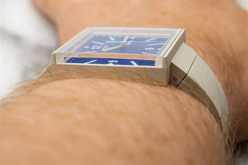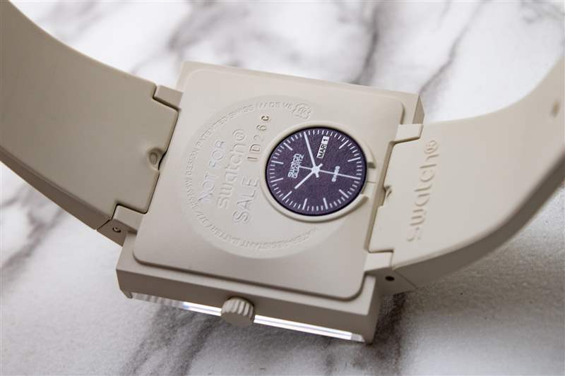Swatch What If? 的啞光生物陶瓷表殼寬 33 毫米?線條足夠小,幾乎適合任何手腕,但尖銳的棱角形狀有助于它們顯著脫穎而出。這些手機殼有多種顏色可供選擇,包括黑色、中灰色、森林綠和奶油米色(我們的測試樣品有黑色和米色),這些手機殼概念簡單,但執(zhí)行起來卻很微妙。從字面上看,主箱體只是一個正方形。這里沒有嘗試塑造輪廓或刻面,只有四四方方的線條和清晰的角度。盡管如此,表殼還是很輕、很舒適,戴在手腕上很舒服。表耳是這里的一個主要因素,其下垂的帶帽形狀自然地貼合手腕的形狀,同時又不影響純粹的棱角設計語言。此外,這種經(jīng)常被詆毀的生物陶瓷材料在這一應用中大放異彩,具有令人信服的絲滑、近乎失重的感覺和輕微紋理的單色啞光外觀,成功地傳達了該品牌所追求的 80 年代時代的風格(特別是米色表殼看起來像是可以舉起來的)來自當時制造原始 Apple Macintosh 臺式電腦的同一條生產(chǎn)線)。這個案例最大的風格亮點在概念上也非常簡單。生物玻璃水晶不是簡單地位于表殼頂部,而是環(huán)繞在 3 點鐘和 9 點鐘位置,幾乎延伸至表殼側面的中間位置。這不僅使得表盤可以從近90度的角度觀看,而且還為整個腕表賦予了一種迷人的空靈、開放的氣質(zhì)。斯沃琪 (Swatch) 進一步向圓形表款致敬,而圓形表款實際上是從 What If? 的底蓋開始的。線。每個型號的電池蓋都以令人印象深刻的細節(jié)描繪了 80 年代早期 Swatch 表盤原版之一。雖然這些表背可能是厚顏無恥的自我指涉,但它們遠非耐用,Swatch 對該系列的防水深度僅為 20 米。廣告留言廣告信息結束