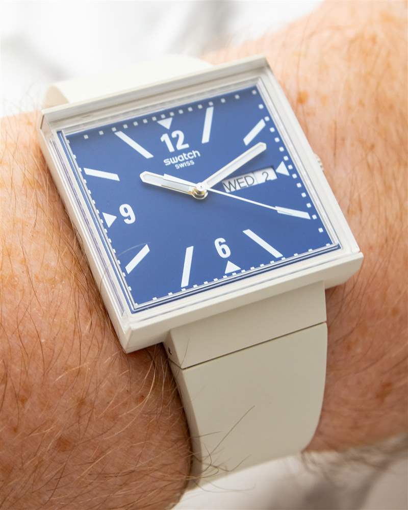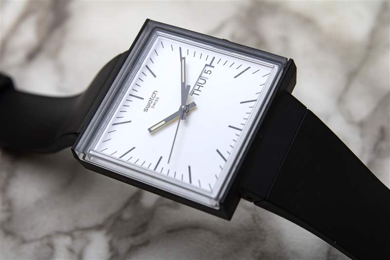 Swatch What If 中的每個型號?系列提供自己的表盤布局。黑色表款的整體設計超簡約,采用啞光白色底座,簡單的黑色印刷小時和分鐘線條,以及夜光黑色指揮棒式聽筒。相比之下,米色外殼的模型給整個過程帶來了更多的個性。寶藍色表盤表面仍然非常平坦和啞光,但印刷的白色阿拉伯數(shù)字和傾斜索引的混合增加了布局的復雜性。外部分鐘刻度的厚實印刷方塊以圖形方式展示了方形表盤計時的獨特怪癖及其擠壓和拉伸的位置,使表盤在手腕上具有近乎現(xiàn)代藝術風格的感覺。一組拋光的直劍手完成了布局,